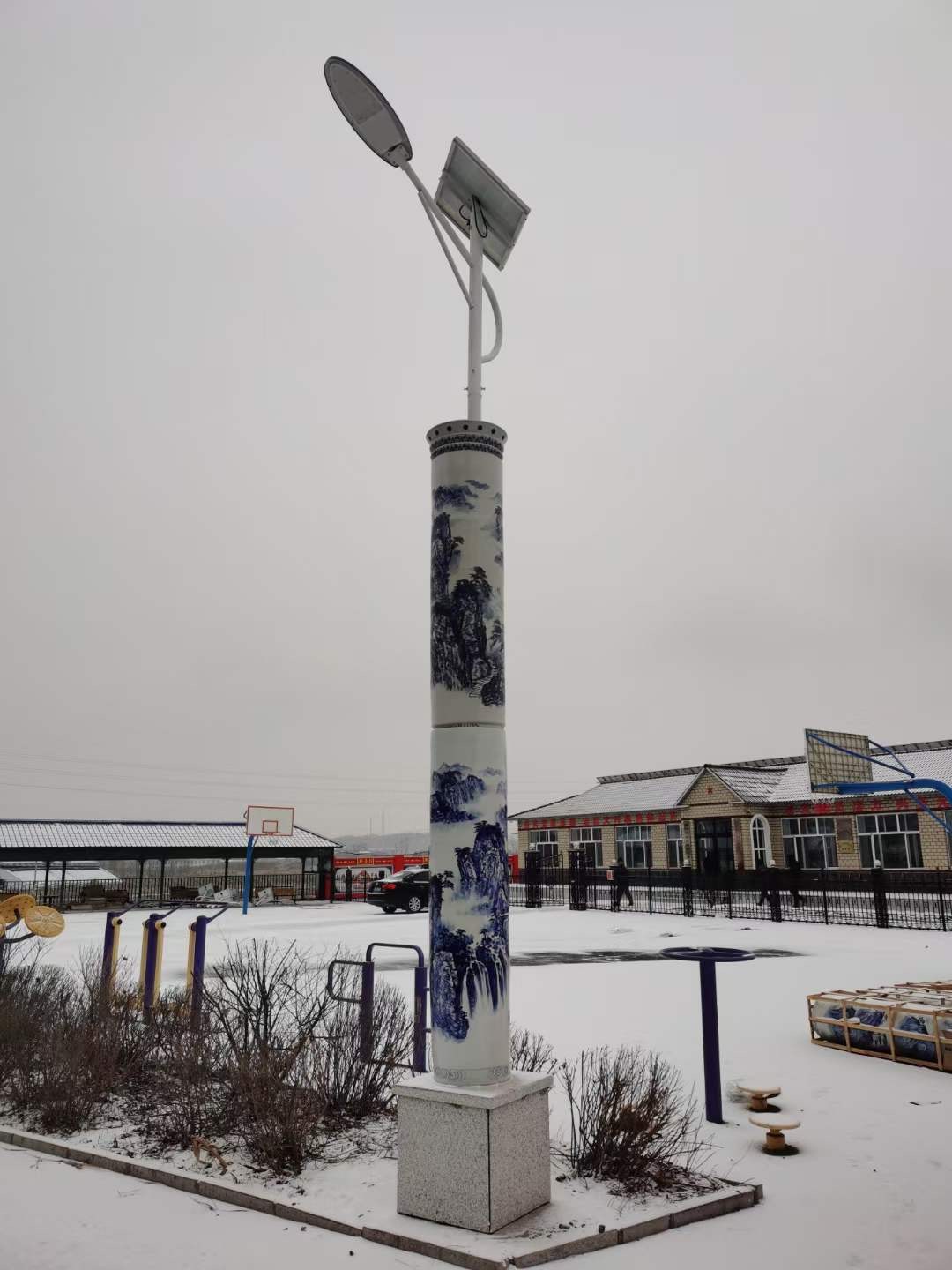 陶瓷灯柱的配置,如下:高1.9米,直径0.45米,每根两节,一套两根,陶瓷灯柱画面主要以山水画为主,每一节下面打一个洞,写景德镇制,由于顾客不知道怎么安装,所以派了专业人员去指导安装,本次的运费也我们这边出的。来看看产品:
