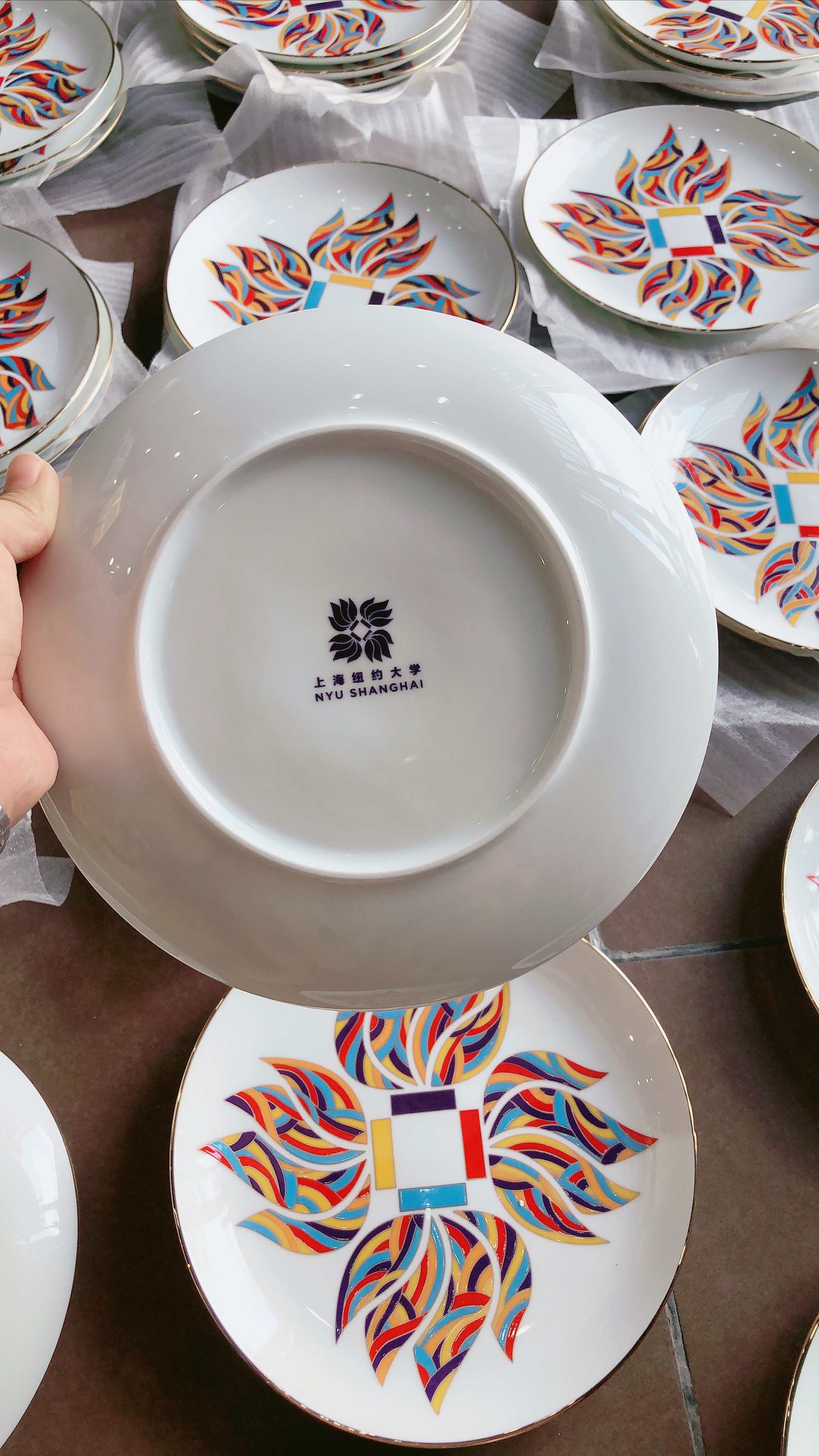 上海纽约大学是一所中外合办的大学,其校训是坚持并超越,让世界成为你的课堂。就如我们的陶瓷文化,一直在世界各种文化的冲击中变得更好更包容。这次和上海纽约大学的合作也非常愉快,他们希望定制一批纪念品,最终定下以校徽为图,陶瓷盘为底的纪念盘。经过公司设计和工匠与校方沟通下,将四格纽约大学的火炬部分改为更明艳的彩釉,突出纽约大学的着重点,达到纪念的效果。