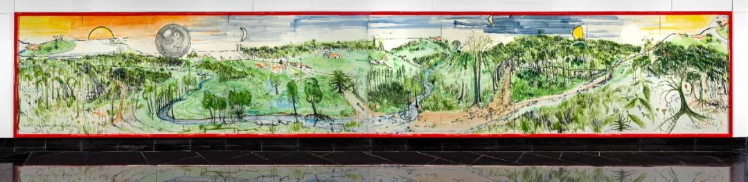 《城市·森林》的创作灵感源于法布里斯对上海充满活力的印象,他决定展现自己生长的山谷全景。为呈现辽阔景象,我们工厂制作并拼接了多块大型瓷板,形成宽12米、高2米的巨幅画作。由于瓷板重量,衔接成巨大挑战,但技艺精湛的匠人确保了其天衣(yi)无缝。为还原(yuan)山谷风貌,我们准备了各式(shi)画笔和近百种颜(yan)色釉,在(zai)法布里斯的手里(li),这些工具和材(cai)料仿佛(fo)被(bei)赋予生命,最终(zhong)呈(cheng)现(xian)出一幅(fu)生动(dong)的山(shan)谷(gu)风景画(hua)卷(juan)。